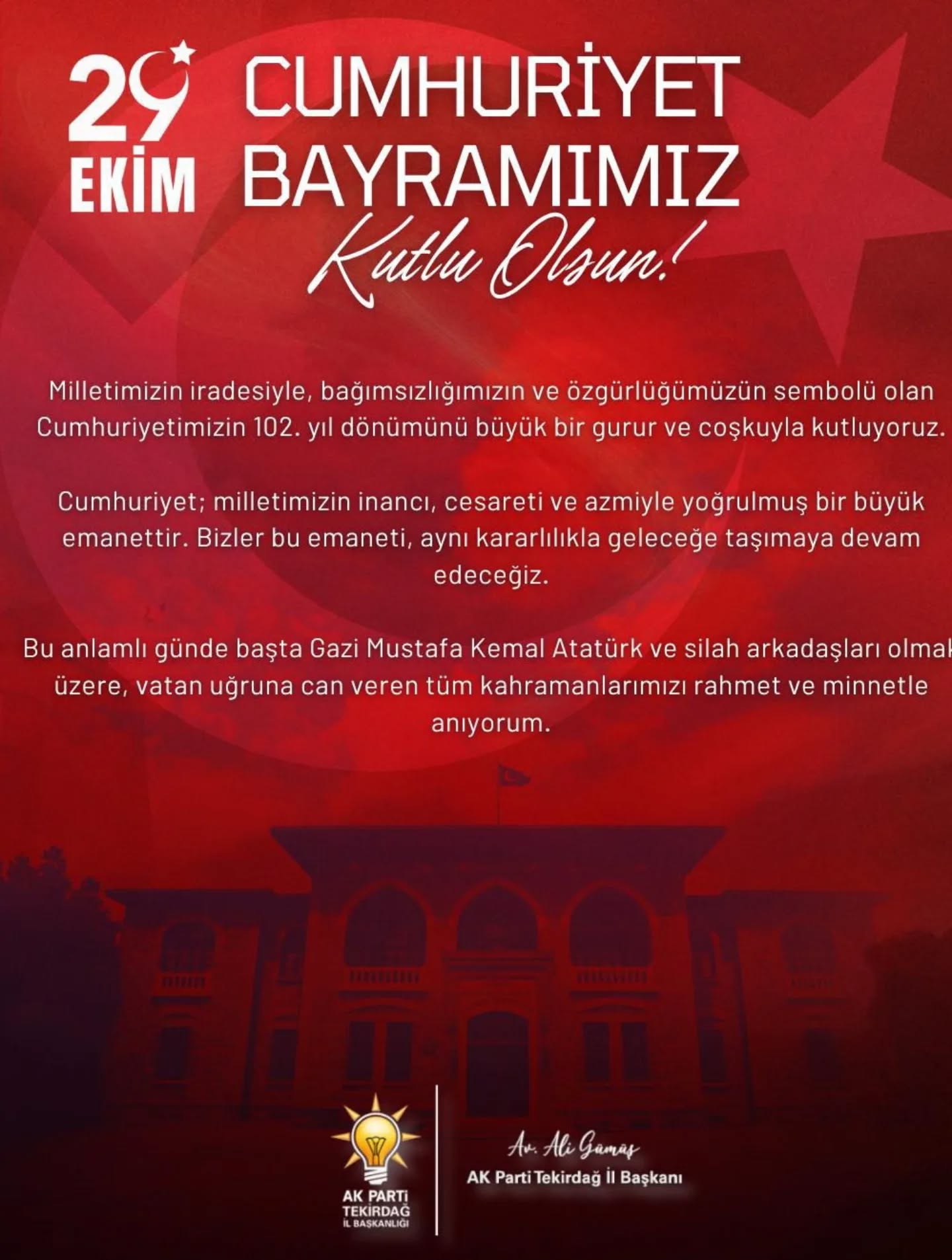 Gümüş mesajında, “Milletimizin iradesiyle, bağımsızlığımızın ve özgürlüğümüzün sembolü olan Cumhuriyetimizin 102. yıl dönümünü büyük bir gurur ve coşkuyla kutluyoruz. Cumhuriyet; milletimizin inancı, cesareti ve azmiyle yoğrulmuş büyük bir emanettir. Bizler bu emaneti aynı kararlılıkla geleceğe taşımaya devam edeceğiz” ifadelerini kullandı.