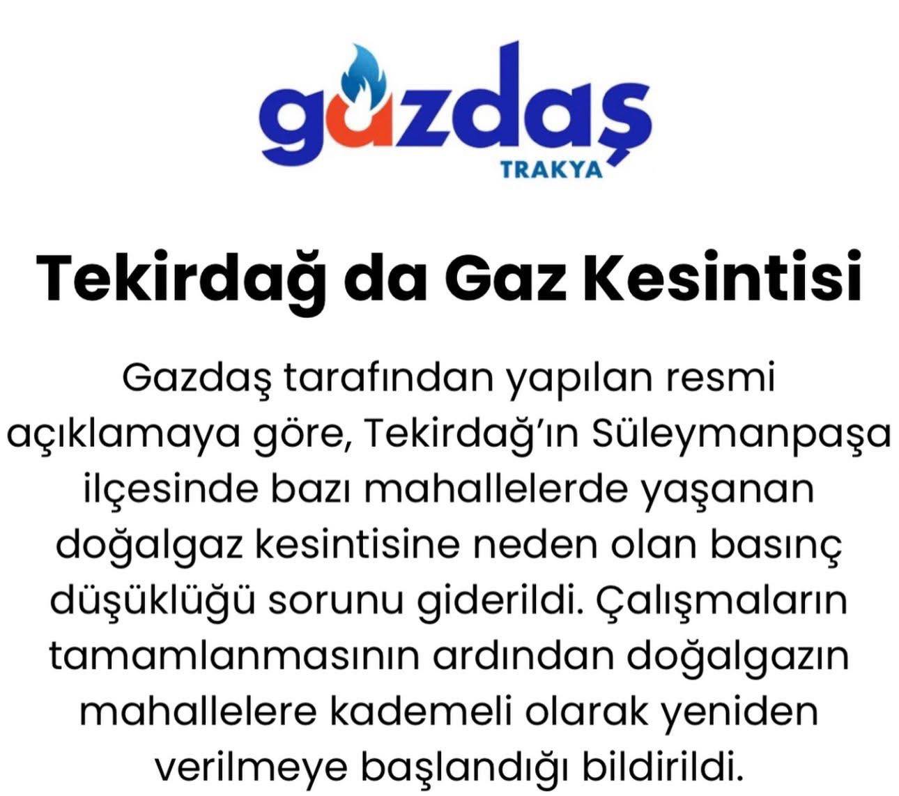 Gazdaş Trakya tarafından yapılan resmi açıklamaya göre, Tekirdağ’ın Süleymanpaşa ilçesinde bazı mahallelerde yaşanan doğalgaz kesintisine neden olan basınç düşüklüğü problemi çözüme kavuşturuldu.