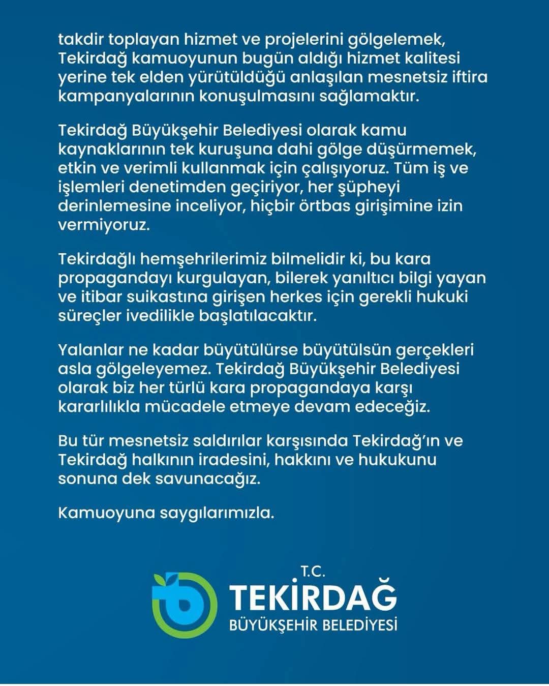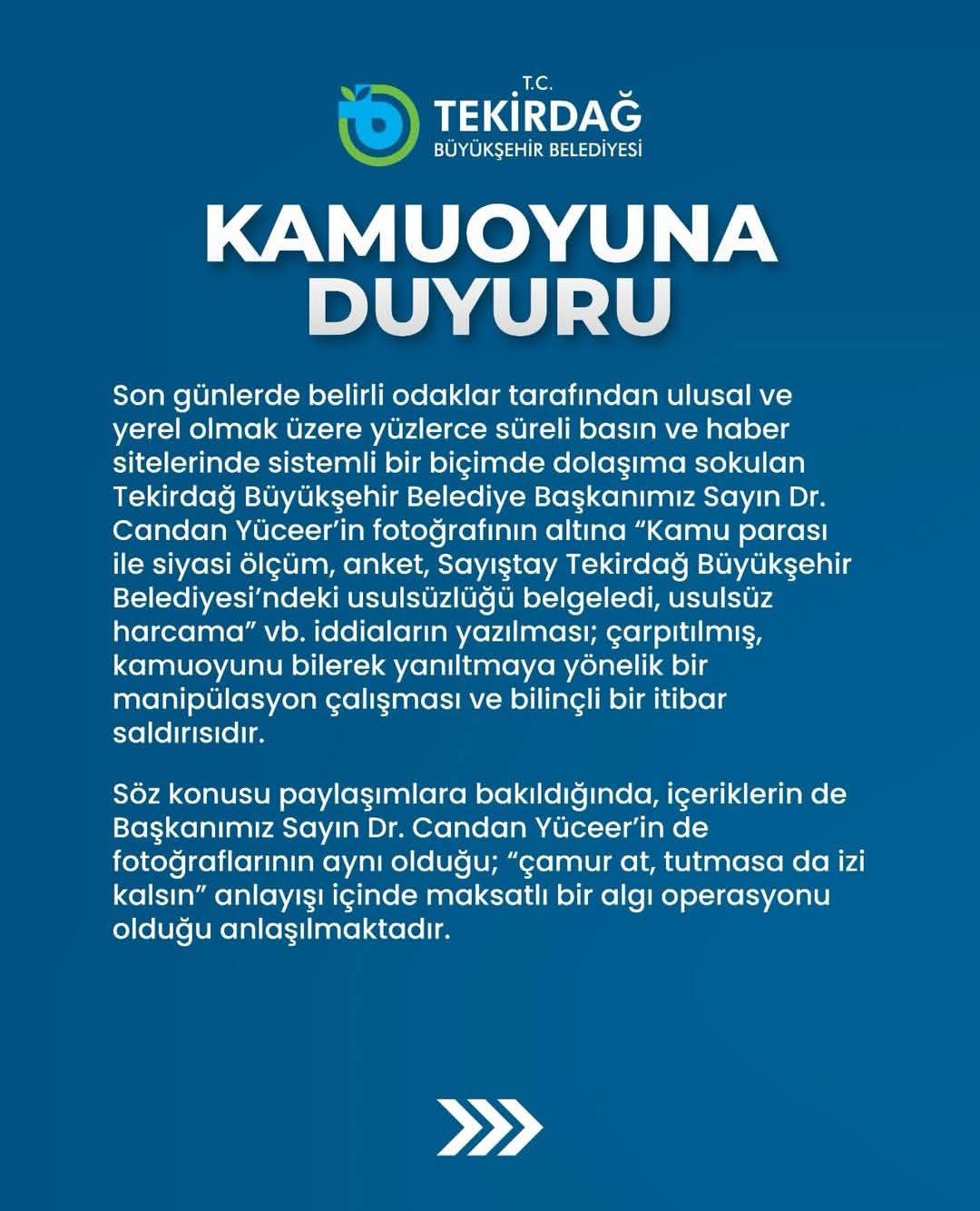 Sayıştay denetim bulgularının ise "iyi yönetimi güçlendirmeye yönelik öneri ve uyarı niteliğinde tespitler" olduğu kaydedilen açıklamada, birçok belediyenin raporunda yer alan ortak bulguların sanki sadece Tekirdağ'a özgüymüş gibi lanse edilmesinin "organize ve kötü niyetli bir çarpıtma çabasının açık göstergesi" olduğu vurgulandı.
