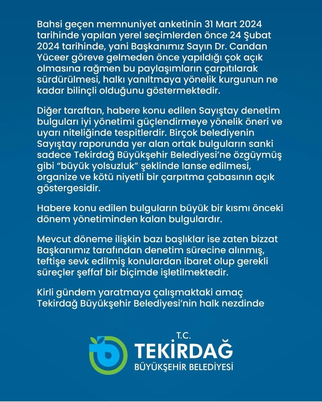 Duyuruda, memnuniyet anketinin 31 Mart 2024 yerel seçimlerinden önce, 24 Şubat 2024'te yapıldığı ve Başkan Yüceer'in göreve gelmesinden önce gerçekleştirildiği belirtilerek, bu bilgiye rağmen iddiaların sürdürülmesinin "halkı yanıltmaya yönelik kurgunun ne kadar bilinçli olduğunu gösterdiği" ifade edildi.