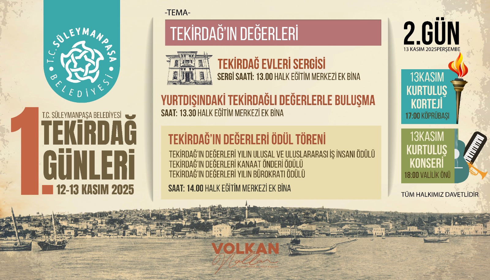 Tüm etkinliklerin halka açık olduğu 1. Tekirdağ Günleri, Süleymanpaşa Belediye Başkanı Volkan Nallar’ın ev sahipliğinde gerçekleştiriliyor. Etkinlik, Tekirdağ’ın tarihi, kültürel ve sanatsal değerlerini bir araya getirerek kente yeni bir gelenek kazandırmayı amaçlıyor.
